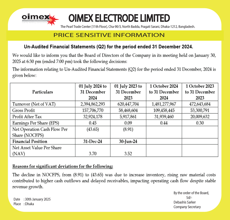 Price Sensitive Information of OIMEX Electrode Ltd.