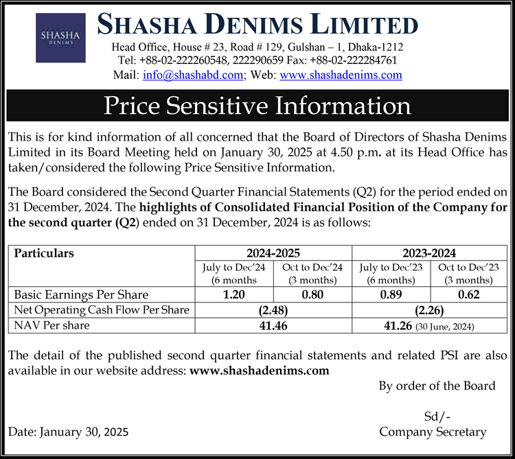 Price Sensitive Information of Shasha Denims Limited