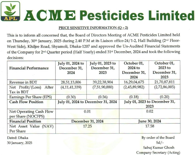 Price Sensitive Information (Q2) of Acme Pesticides Ltd.