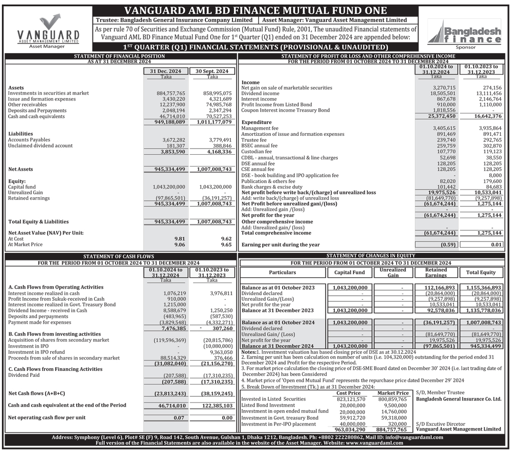 Q1 Financial Statements (Provisional & Unaudited) of Vanguard AML BD Finance Mutual Fund One