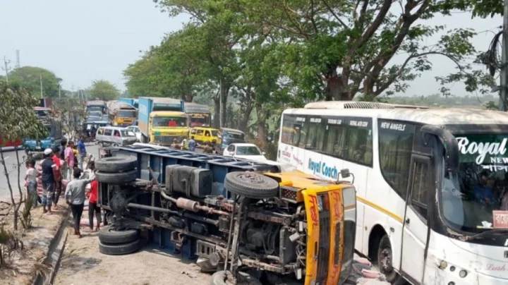 মুন্সীগঞ্জের গজারিয়ায় মেঘনা সেতুর উপর মালবাহী ট্রাক উল্টে প্রায় তিন ঘণ্টা ঢাকা-চট্টগ্রাম মহাসড়কে যান চলাচল বন্ধ ছিল। এতে প্রায় আট কিলোমিটার দীর্ঘ যানজটে পড়েন মহাসড়কের ঢাকামুখি লেনের যাত্রী ও চালকরা।