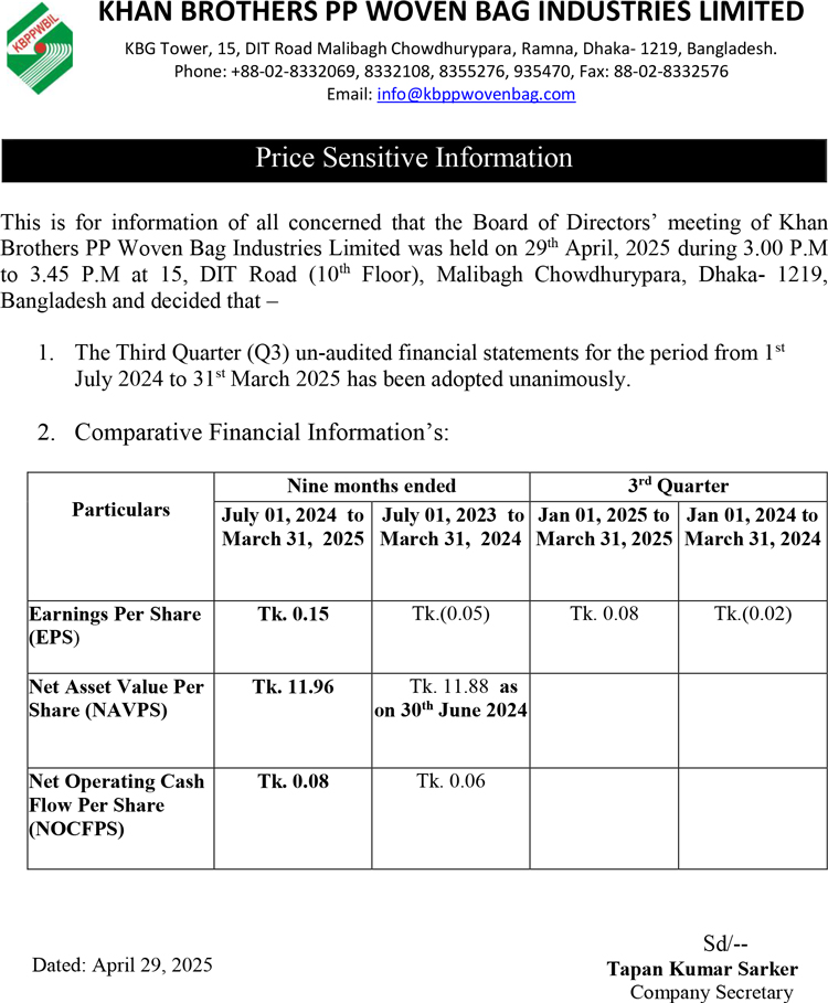 Price Sensitive Information of Khan Brothers PP Woven Bag Limited