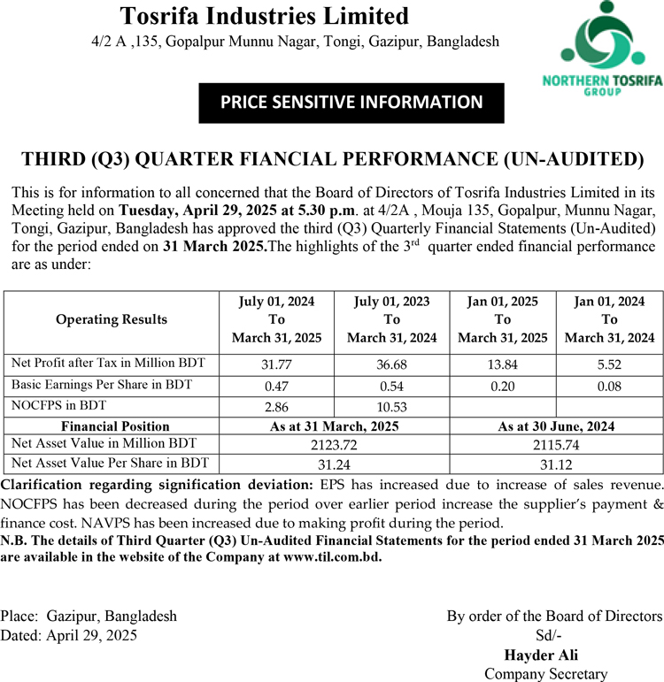 Price Sensitive Information of Tosrifa Industries Limited