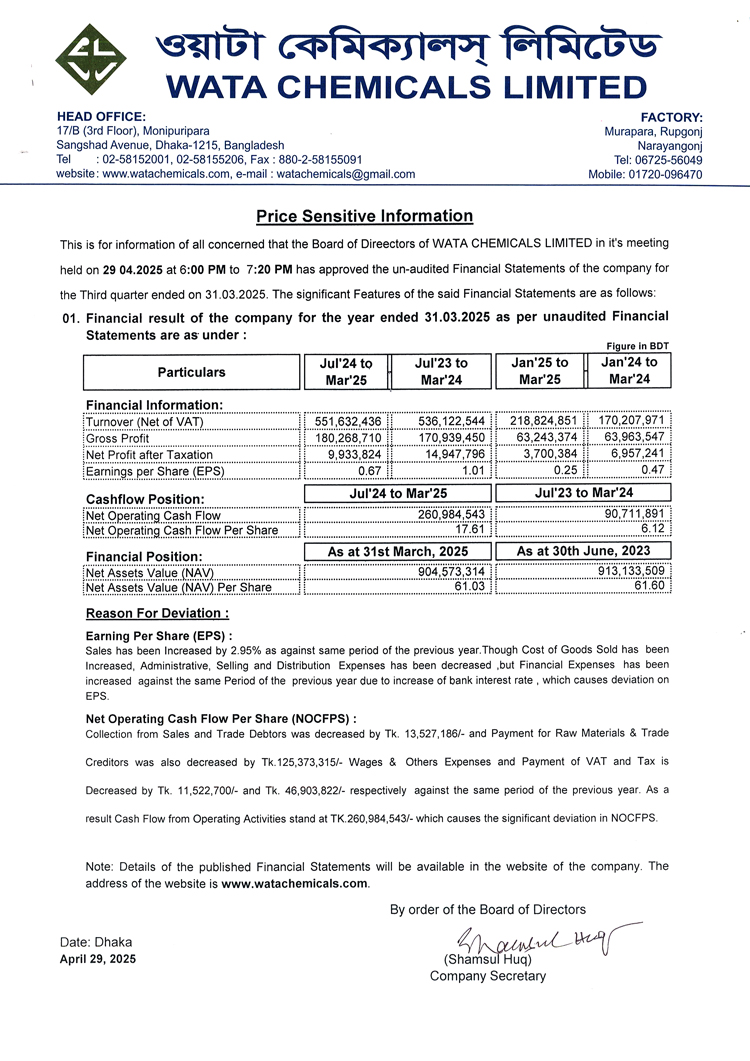 Price Sensitive Information of Wata Chemicals Limited