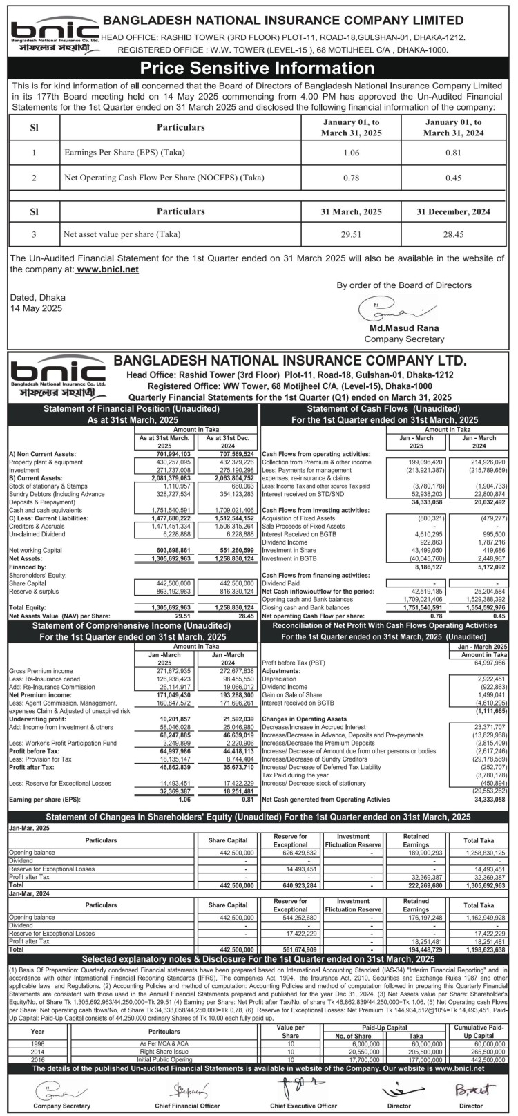 Price Sensitive Information of Bangladesh National Insurance Company Limited