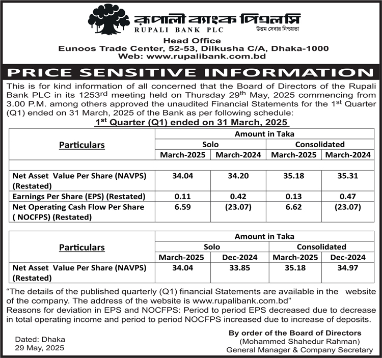 Price Sensitive Information of Rupali Bank PLC