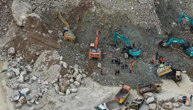 টেলিভিশনের ফুটেজে দেখা গেছে, বড় বড় পাথরখণ্ড সরাতে খননযন্ত্রগুলো কাজ করছে। উদ্ধারকর্মীরা মরদেহভর্তি ব্যাগ অ্যাম্বুলেন্সে সরিয়ে রাখছেন।
