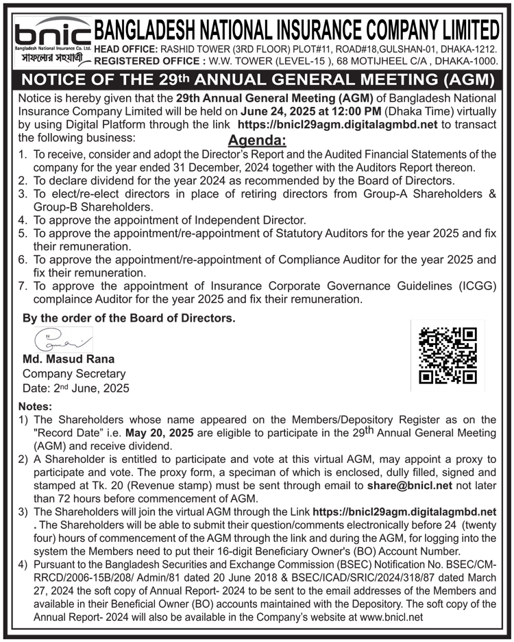 Notice of the 29th AGM of Bangladesh National Insurance Company Limited