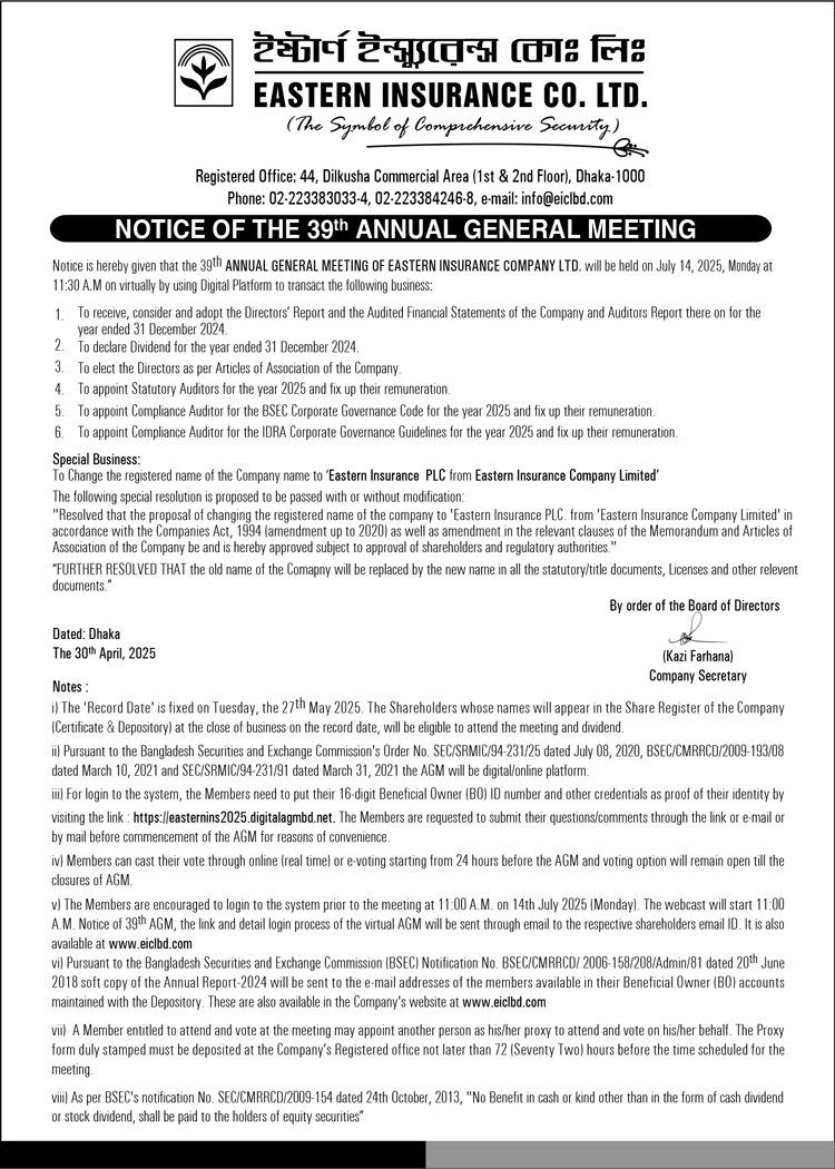 Notice of the 39th AGM of Eastern Insurance Co. Ltd.