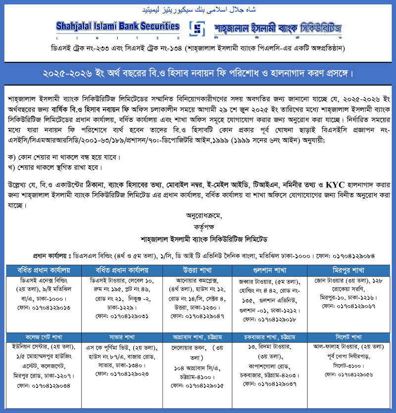 শাহজালাল ইসলামী ব্যাংক সিকিউরিটিজ লিমিটেড এর বিও হিসাব নবায়ন (২০২৫-২৬) সংক্রান্ত বিজ্ঞপ্তি