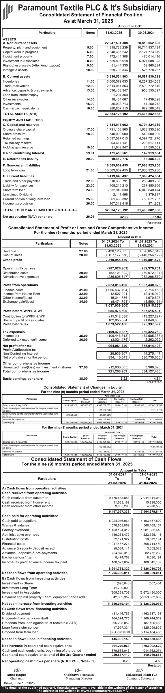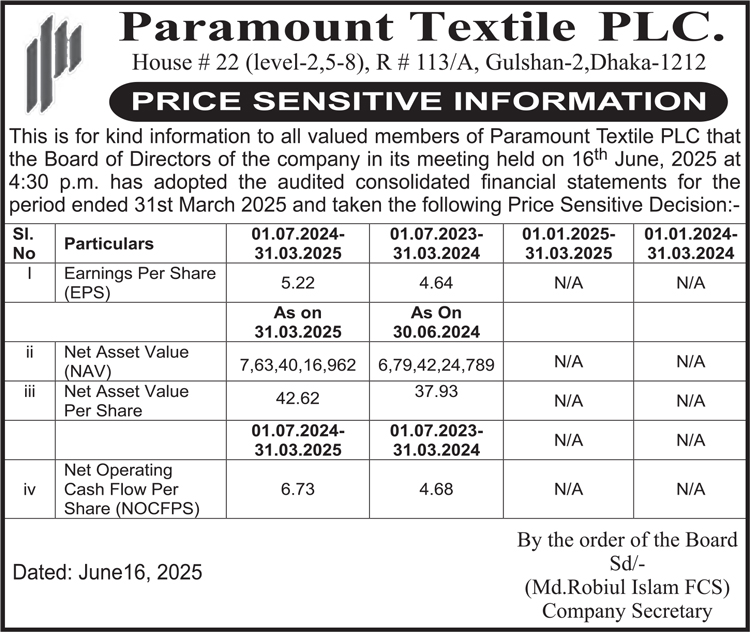 Price Sensitive Information of Paramount Textile PLC