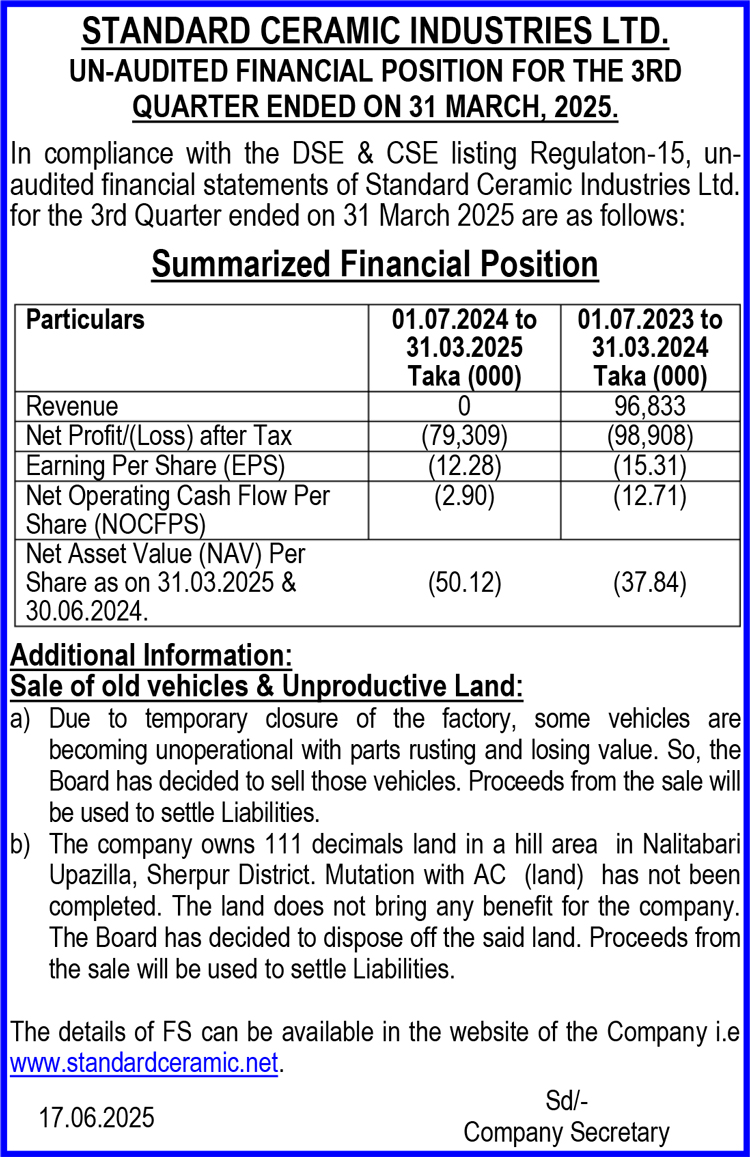 Q3 Un-audited Financial Statements of Standard Ceramic Industries Ltd.