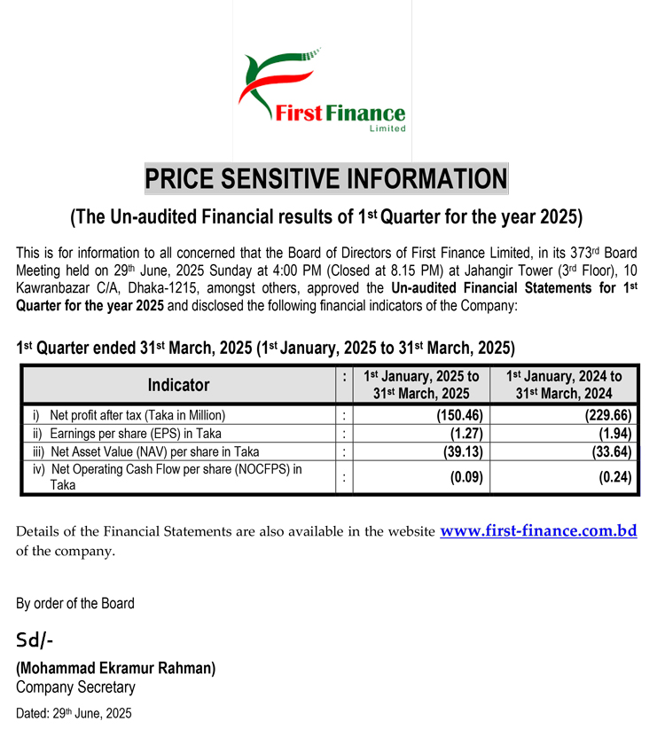 Price Sensitive Information (Q1) of First Finance Limited