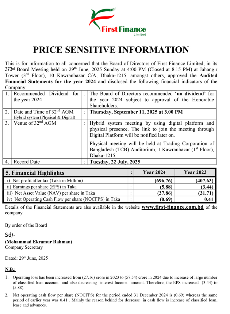 Price Sensitive Information of First Finance Limited