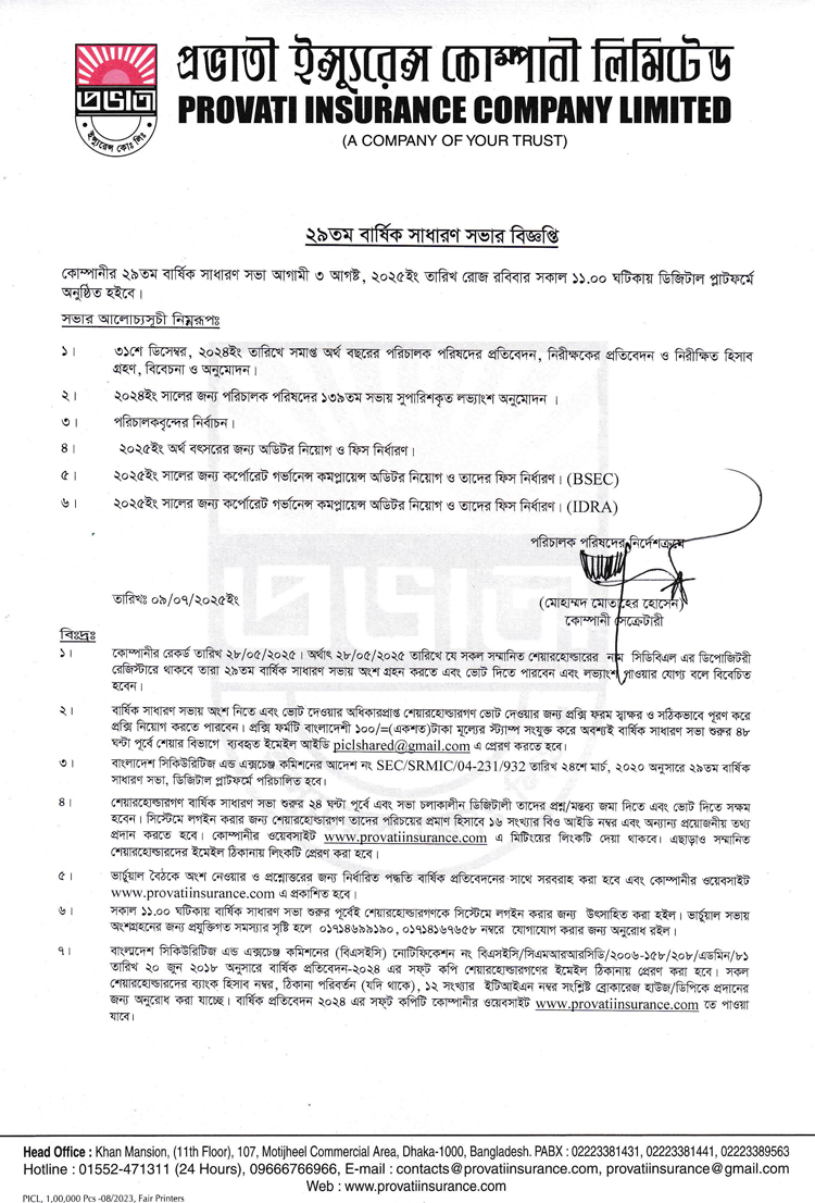 Notice of the 29th AGM of Provati Insurance Company Ltd.