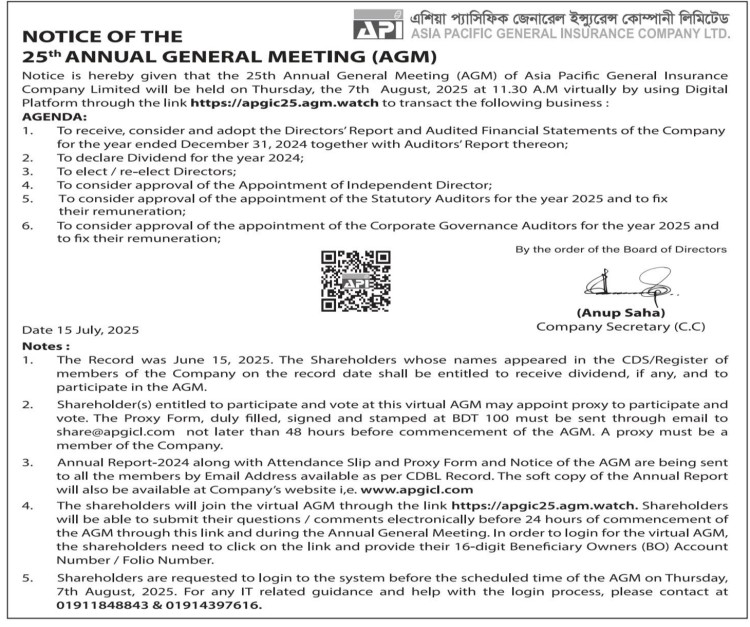 Notice of the 25th AGM of Asia Pacific General Insurance Company Limited