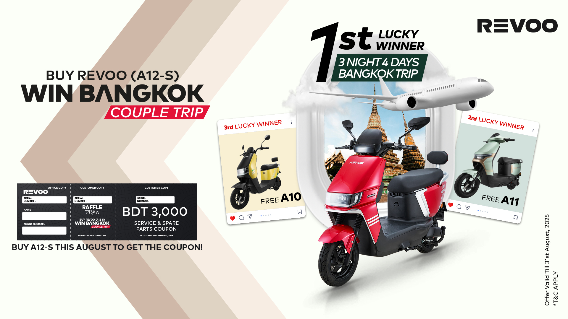 পুরো আগস্ট মাসজুড়েই চলবে রিভোর এ ক্যাম্পেইন। মাসের শেষে লটারি ড্রয়ের মাধ্যমে নির্বাচিত হবেন তিনজন ভাগ্যবান বিজয়ী। প্রথম পুরস্কার বিজয়ী পাবেন ব্যাংককে তিন রাত চার দিনের কাপল ট্রিপের সুযোগ। দ্বিতীয় পুরস্কার বিজয়ীর জন্য রয়েছে ৬০ ভোল্ট ও ২৬ অ্যাম্পিয়ার গ্রাফিন ব্যাটারির রিভো এ১১। এ বাইকটি একবার চার্জে চলবে ৭৫ থেকে ৮৫ কিলোমিটার, আর সর্বোচ্চ গতি ঘণ্টায় ৪৫ কিলোমিটার। তৃতীয় পুরস্কার বিজয়ীর জন্য থাকছে রিভো এ১০। কম্যিউটিং এ ই-বাইকে রয়েছে ৮০০ ওয়াট মোটর এবং ৪৮ ভোল্ট ২৬ অ্যাম্পিয়ার ব্যাটারি। বাইকটির ঘণ্টাপ্রতি সর্বোচ্চ গতি ৪০ কিলোমিটার এবং একবার চার্জে চলবে ৬৫ থেকে ৭৫ কিলোমিটার।