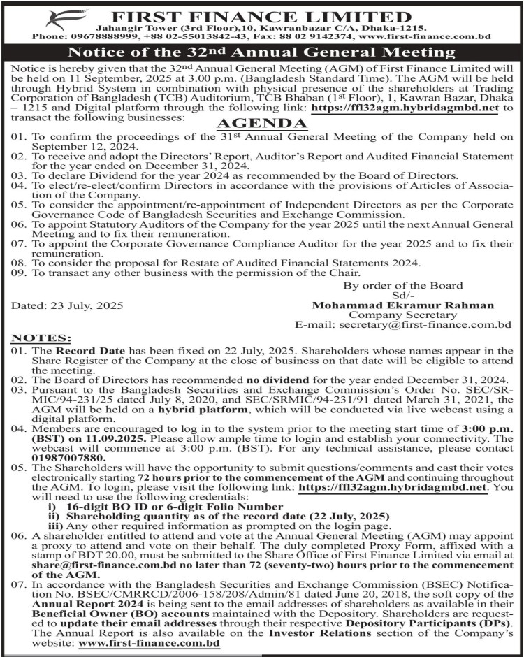 Notice of the 32nd AGM of First Finance Limited