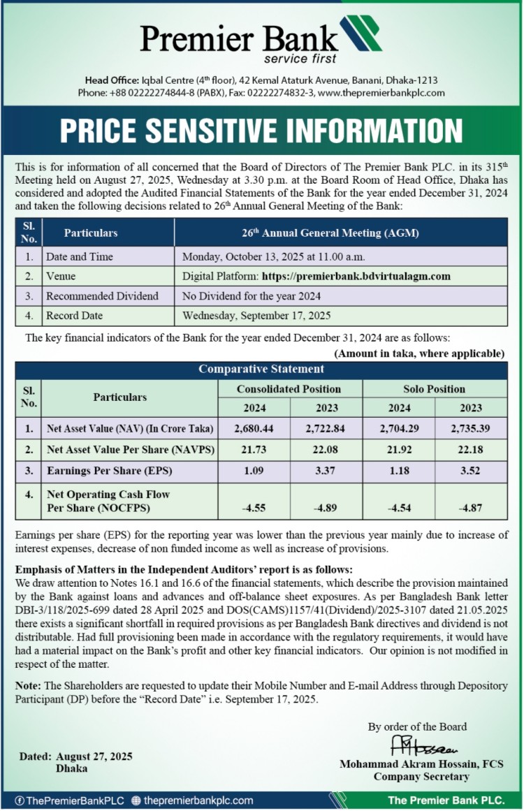 Price Sensitive Information of Premier Bank
