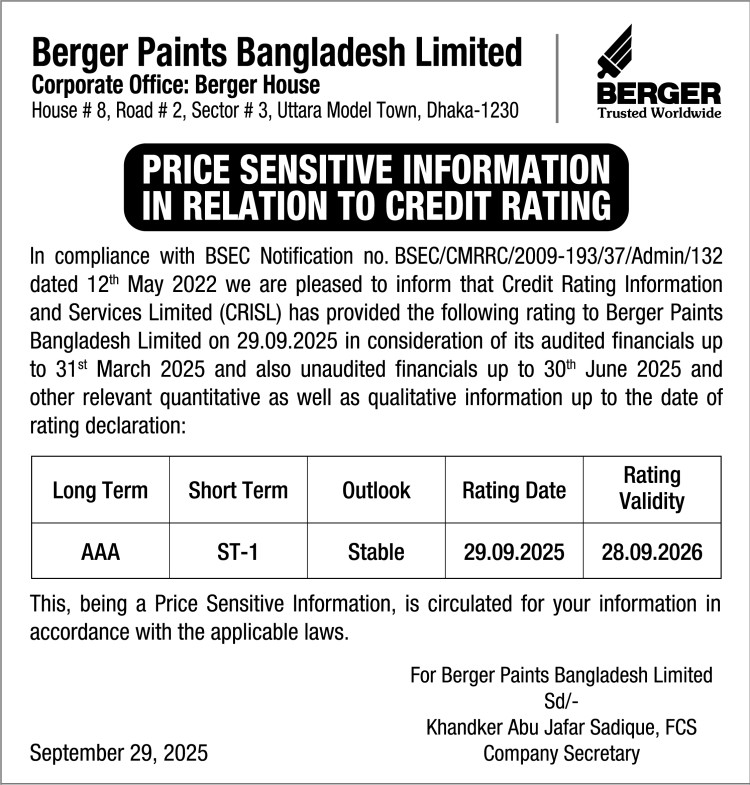 Price Sensitive Information of Berger Paints Bangladesh Limited