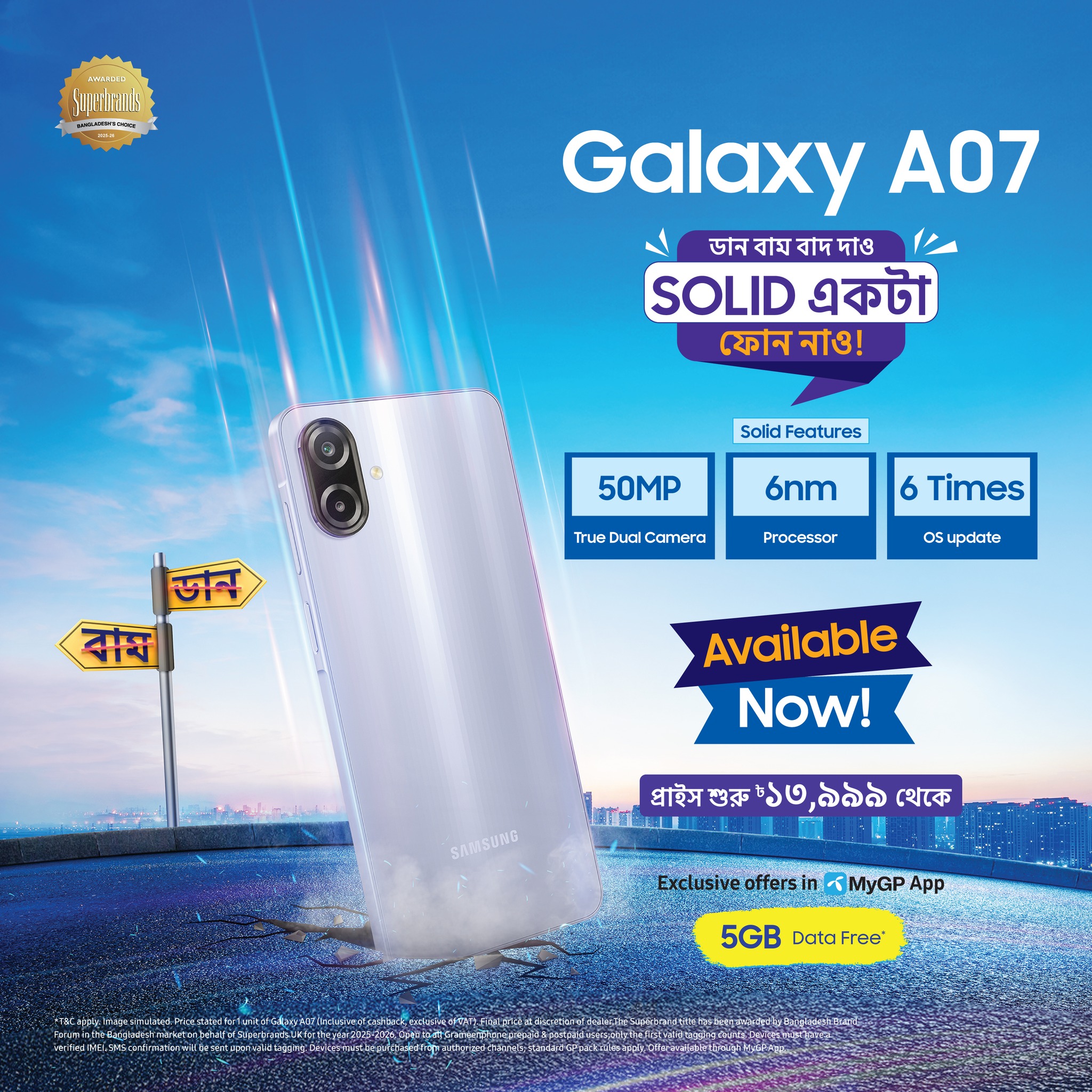 গ্যালাক্সি এ০৭ উন্মোচনের মাধ্যমে স্যামসাং আবারও প্রমাণ করেছে যে প্রতিষ্ঠানটি ব্যবহারকারীদের কথা বিবেচনা করে প্রযুক্তি উদ্ভাবন ও দামের মধ্যে সামঞ্জস্য বজায়ে নিরলস কাজ করে যাচ্ছে। স্মার্টফোনটিতে দৈনন্দিন প্রয়োজন পূরণের পাশাপাশি দীর্ঘমেয়াদি ব্যবহারযোগ্যতা ও প্রাসঙ্গিকতার ওপরও গুরুত্বারোপ করা হয়েছে। স্মার্টফোনটির বাজারমূল্য শুরু হয়েছে ১৩,৯৯৯ টাকা থেকে।