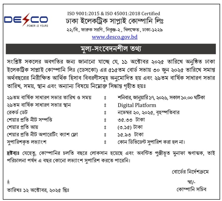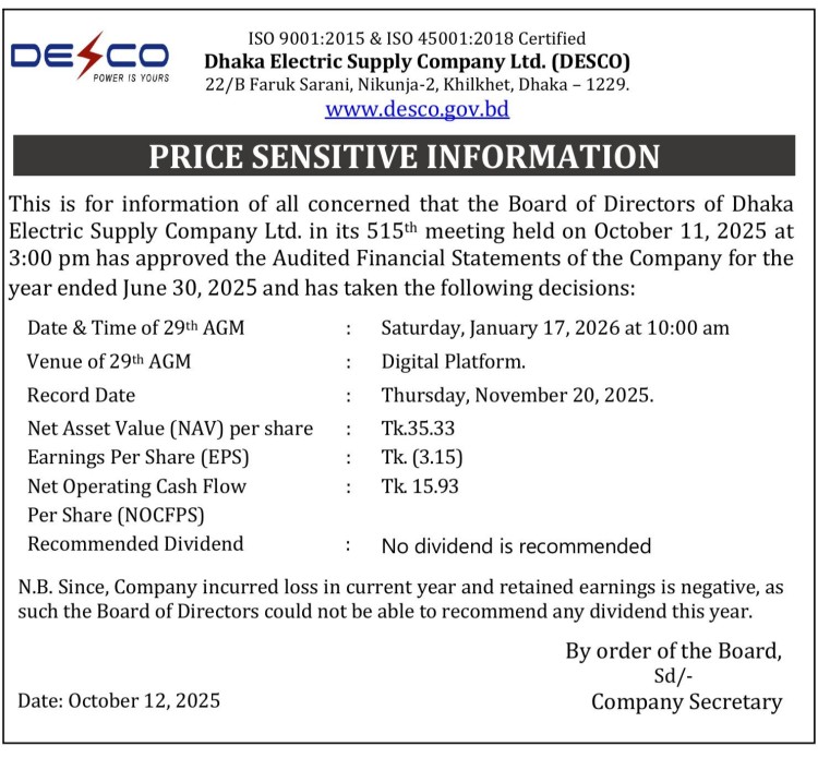 Price Sensitive Information of Dhaka Electric Supply Company Limited