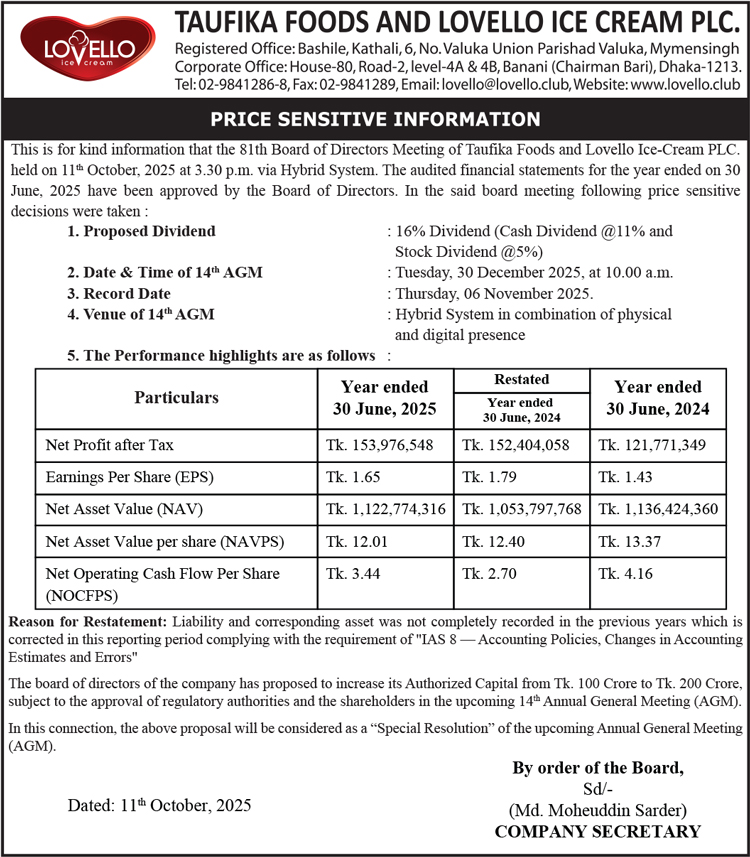 Price Sensitive Information of Taufika Foods and Lovello Ice-cream PLC.