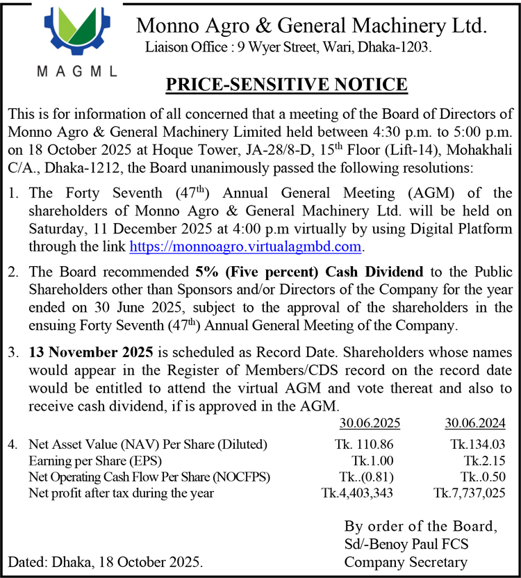 Price Sensitive Information of Monno Agro & General Machinery Limited