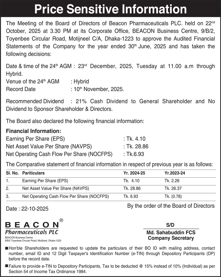 Price Sensitive Information of Beacon Pharmaceuticals PLC.