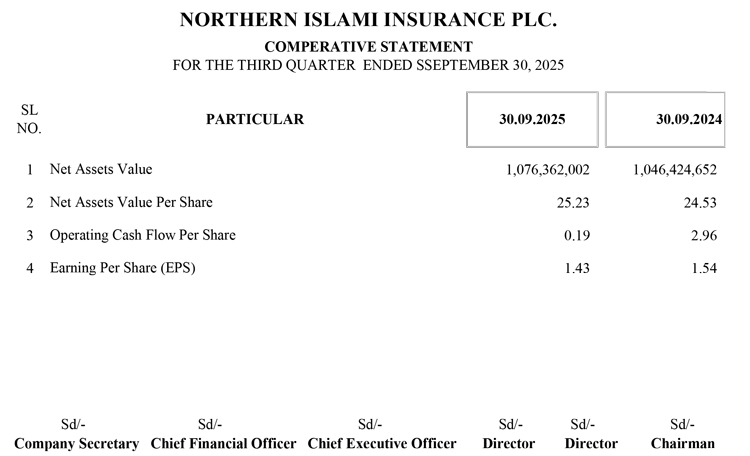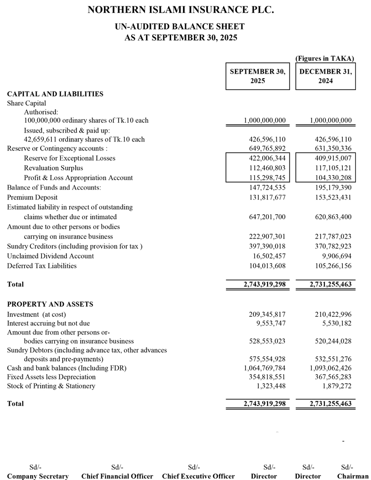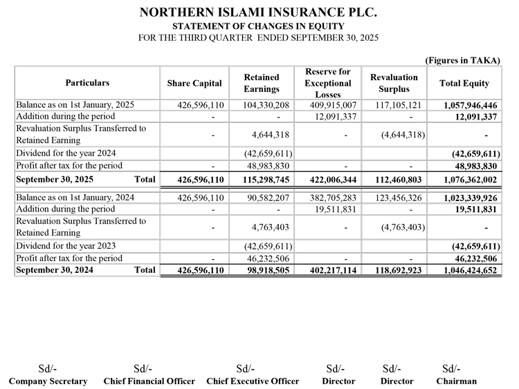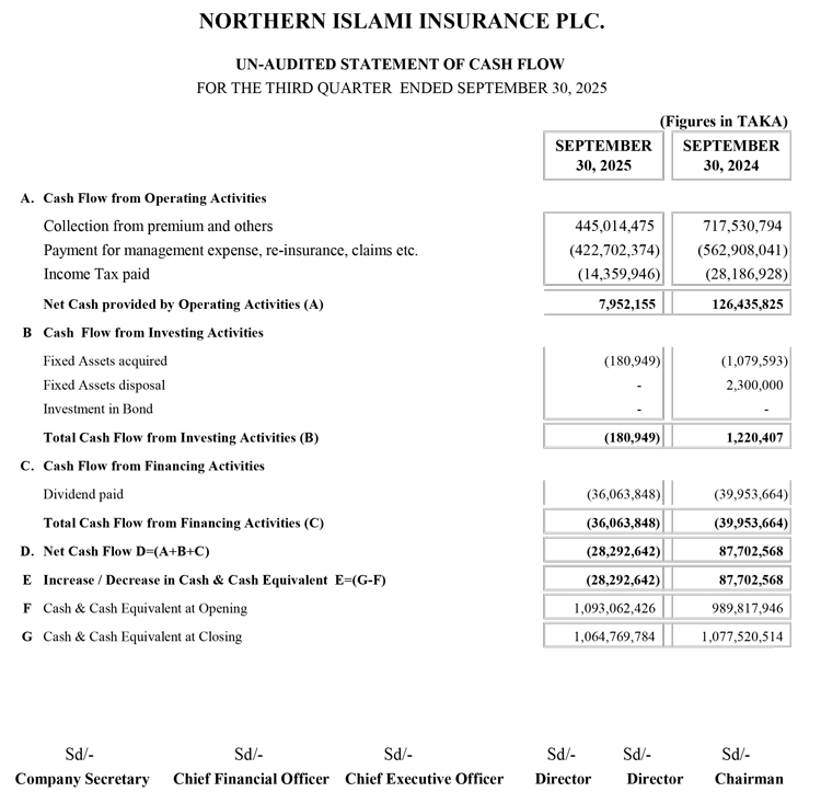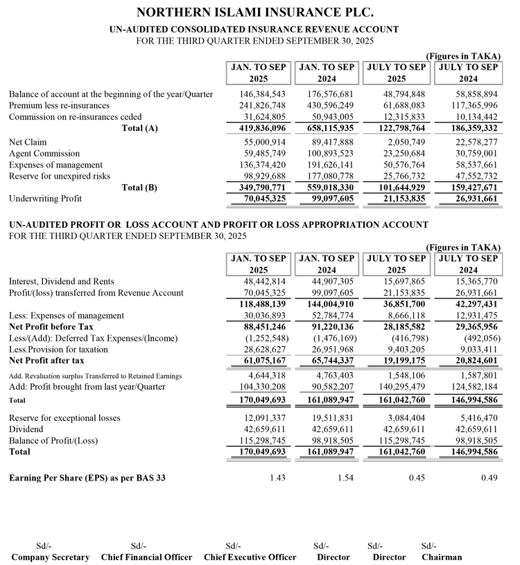 Un-audited Third Quarter Financial Statements of Northern Islami Insurance PLC.