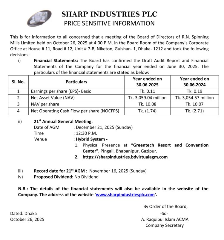 Price Sensitive Information of Sharp Industries PLC.