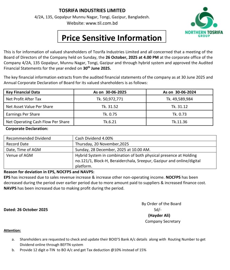 Price Sensitive Information of Tosrifa Industries Limited