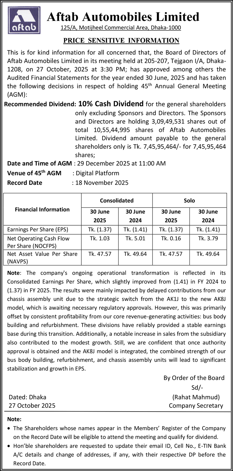 Price Sensitive Information of Aftab Automobiles Limited