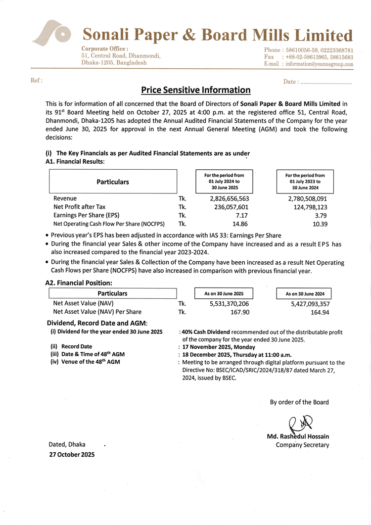 Price Sensitive Information of Sonali Paper & Board Mills Ltd