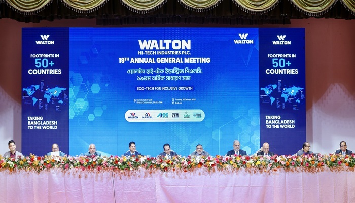 পুঁজিবাজারে তালিকাভুক্ত প্রকৌশল খাতের কোম্পানি, সুপারব্র্যান্ড ও টেক জায়ান্ট ওয়ালটন হাই-টেক ইন্ডাস্ট্রিজ পিএলসি’র ১৯তম বার্ষিক সাধারণ সভা (এজিএম) অত্যন্ত সফলভাবে অনুষ্ঠিত হয়েছে। দেশের রাজনৈতিক অস্থিরতা ও বাণিজ্যিক প্রতিকূলতার মধ্যেও ১৭৫ শতাংশ ক্যাশ ডিভিডেন্ড দেওয়ায় সভায় সন্তুষ্টি প্রকাশ করে ওয়ালটনের পরিচালনা পর্ষদকে ধন্যবাদ জানান সাধারণ বিনিয়োগকারীরা। তাঁরা দেশে উদ্ভাবনী ও সর্বাধুনিক প্রযুক্তির লিথিয়াম-আয়ন ব্যাটারি উৎপাদন কারখানা স্থাপনে ওয়ালটনের বিনিয়োগের ঘোষণায় উচ্ছ্বাস প্রকাশ করেন। অচিরেই ১০০টিরও বেশি দেশে ওয়ালটনের বৈশ্বিক বাজার সম্প্রসারিত হবে বলে আশাবাদ ব্যক্ত করেন বিনিয়োগকারীরা।