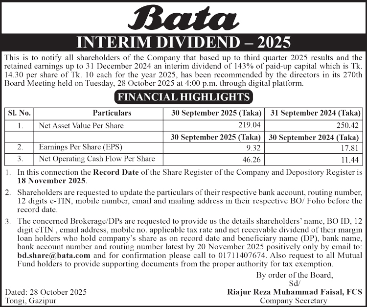 Price Sensitive Information of Bata Shoe Company (Bangladesh) Limited