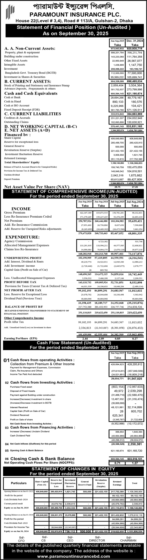 Statements of Financial Position (Un-audited) of Paramount Insurance PLC.