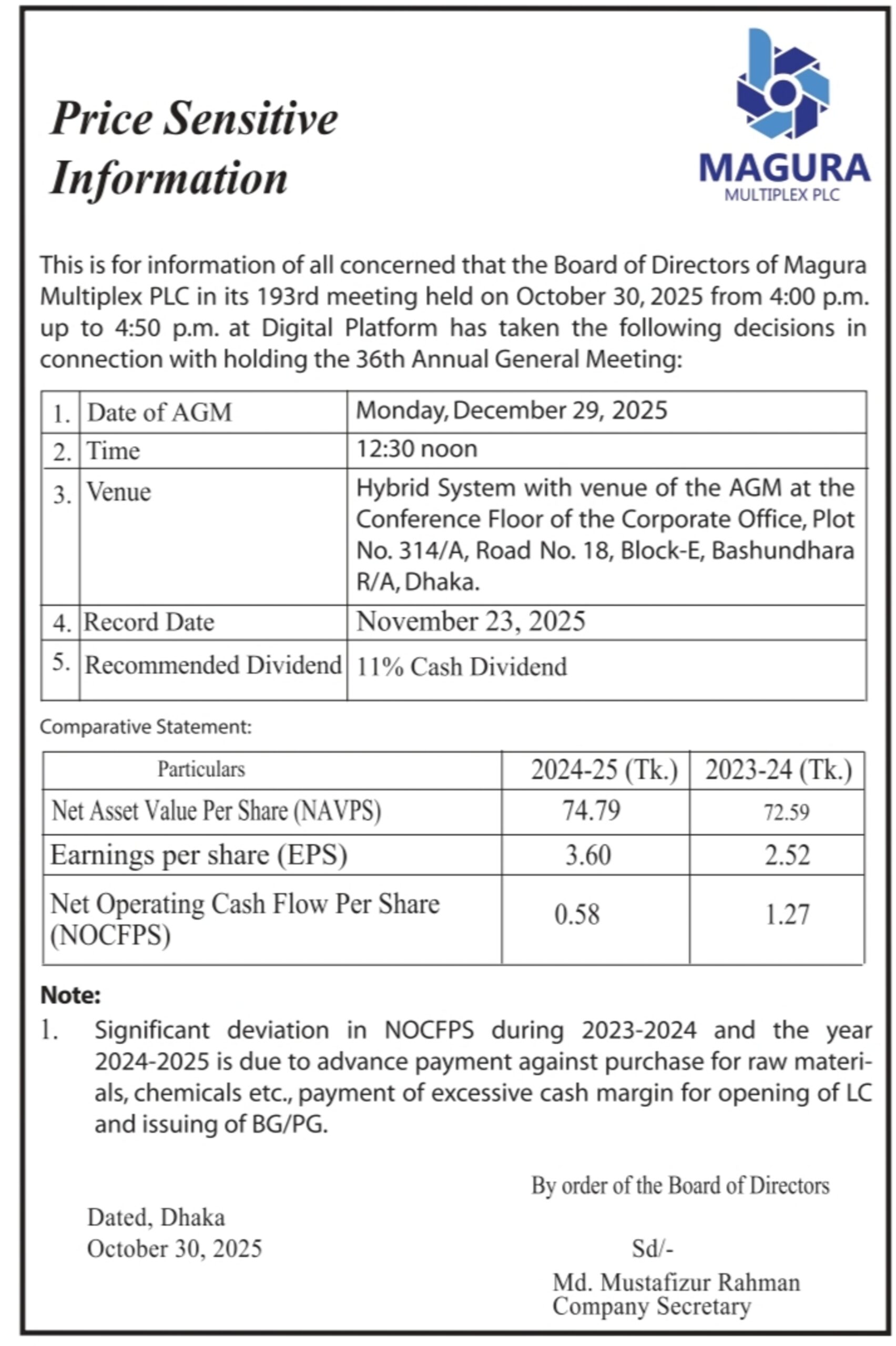 Price Sensitive Information of Magura Multiplex PLC.
