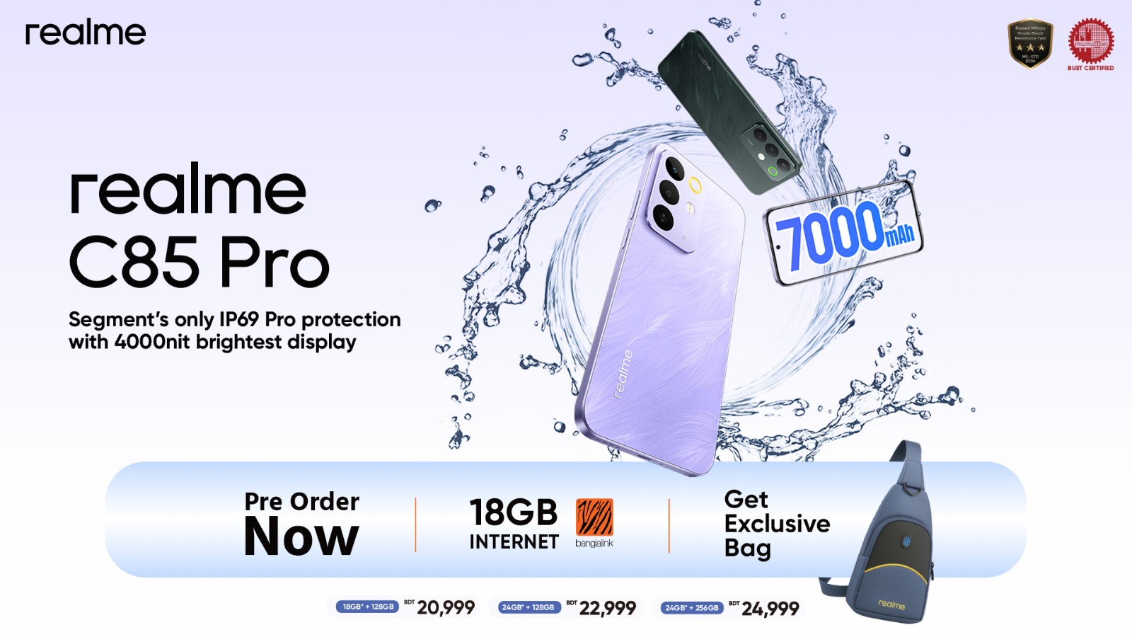 দেশের সকল রিয়েলমি ব্র্যান্ড স্টোর ও অফিসিয়াল রিসেলার আউটলেট থেকে ক্রেতারা ৫-৭ নভেম্বর পর্যন্ত রিয়েলমি সি৮৫ প্রো প্রি-বুক করার সুযোগ পাবেন। এর মাধ্যমে ব্র্যান্ডের সি-সিরিজ স্মার্টফোনের এক্সক্লুসিভ আগাম অ্যাক্সেস উপভোগ করতে পারবেন। প্রি-বুকিংয়ের ক্ষেত্রে ক্রেতারা এক্সক্লুসিভ রিয়েলমি ব্যাগের সাথে বাংলালিংকের বিশেষ অফারসহ আকর্ষণীয় উপহার পাবেন। এই প্রি-অর্ডার উপহারগুলো সীমিত সময় এবং শর্তসাপেক্ষে প্রযোজ্য হবে। ফার্স্ট-সেল চলাকালে রিয়েলমি সি৮৫ প্রো সংগ্রহকারী ক্রেতাদের এই উপহার দেওয়া হবে।