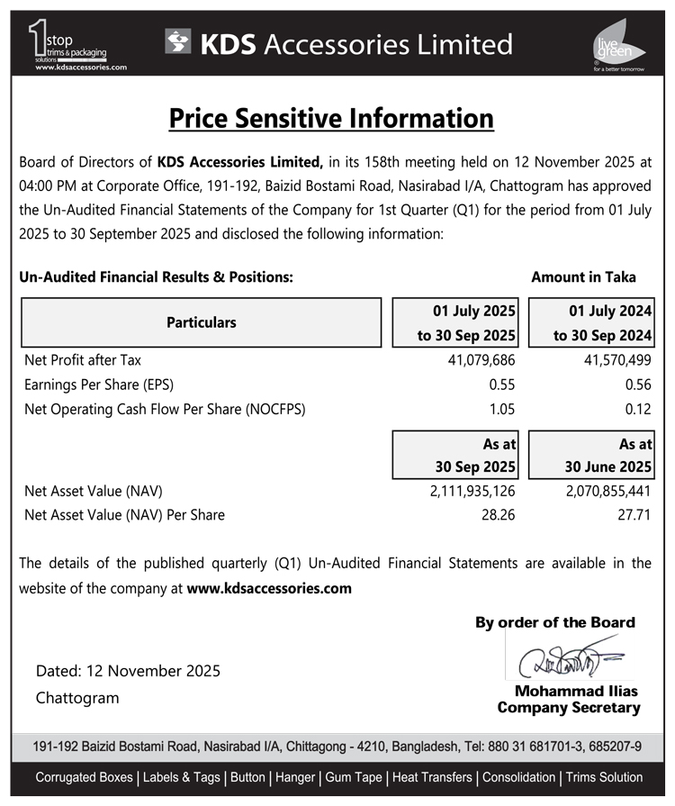 Price Sensitive Information of KDS Accessories Ltd.