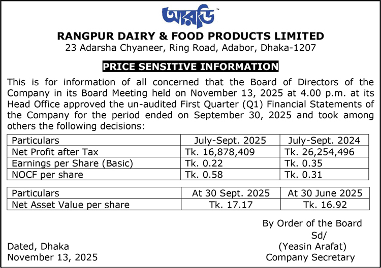 Price Sensitive Information of Rangpur Dairy & Food Products Limited