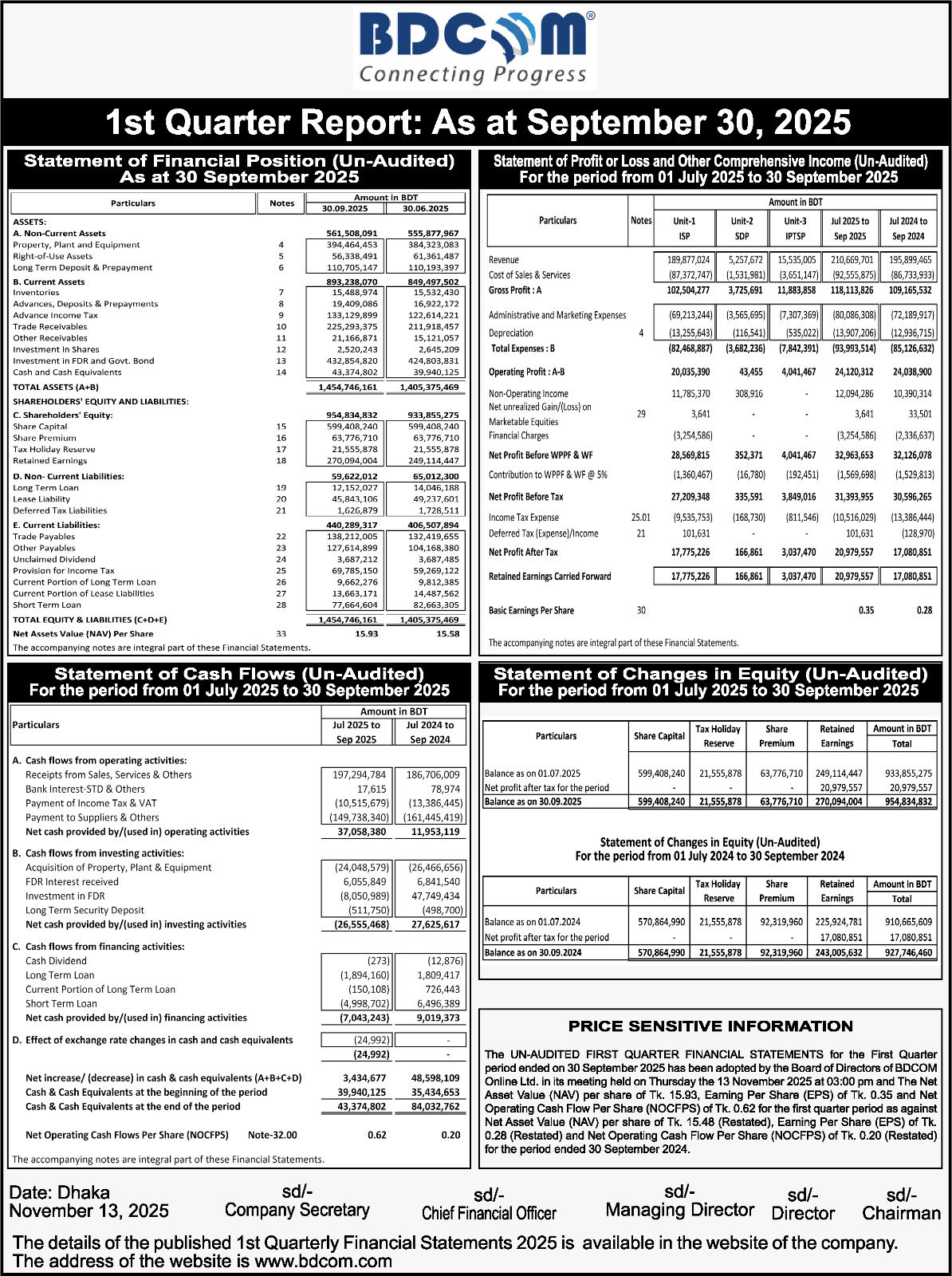 1st Quarter Financial Statements (Unaudited) of BDCOM Online Ltd