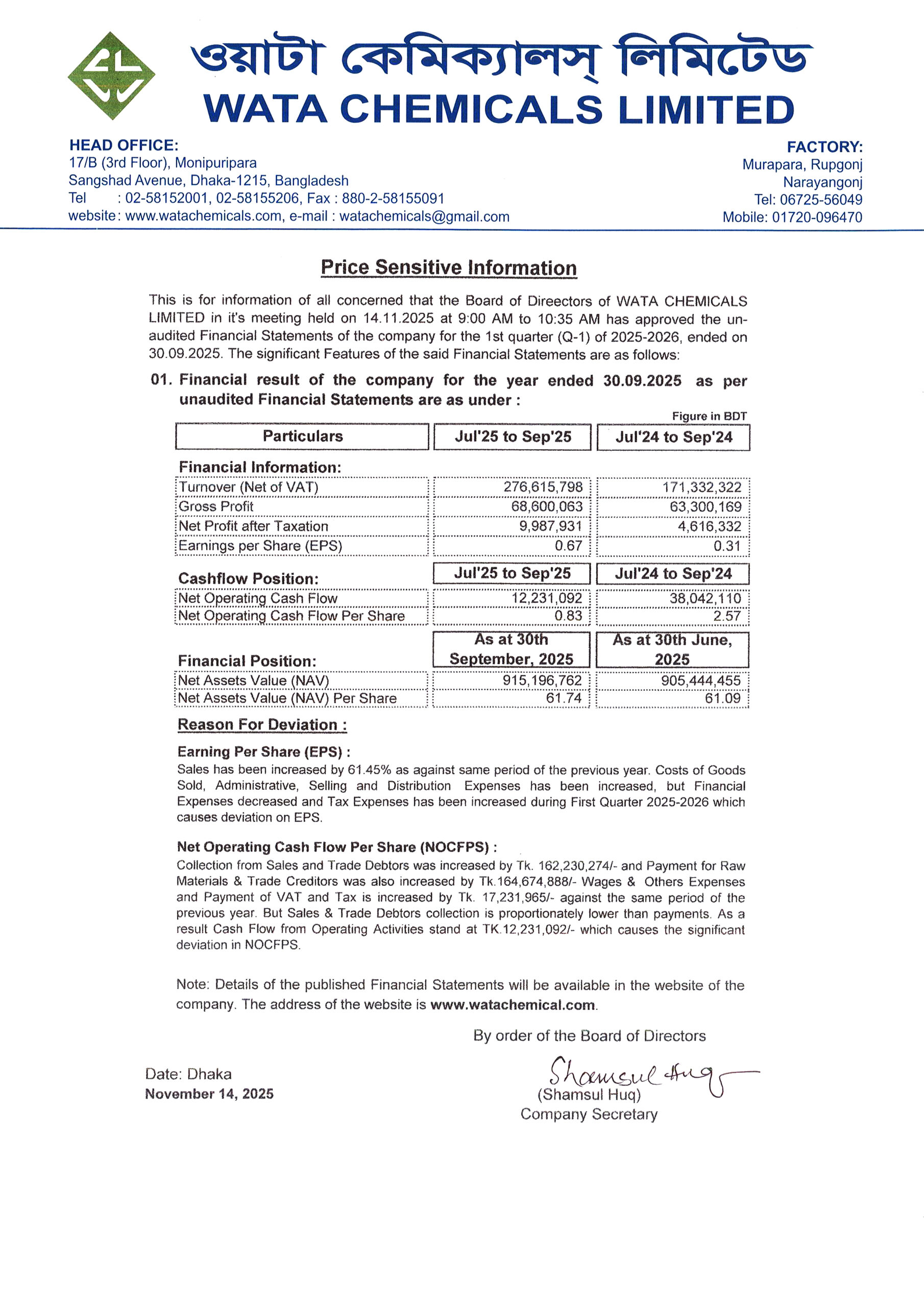 Price Sensitive Information of Wata Chemicals Limited