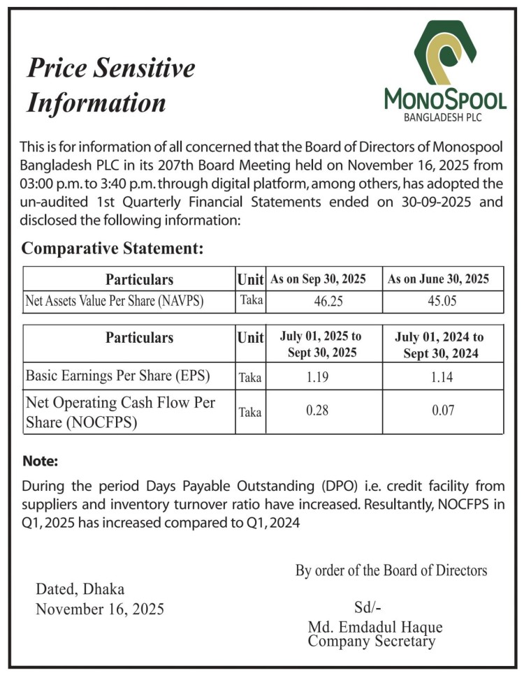 Price Sensitive Information of Monospool Bangladesh PLC.