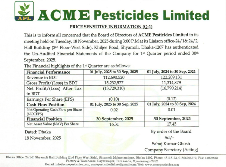 Price Sensitive Information (Q1) Acme pesticides Ltd.