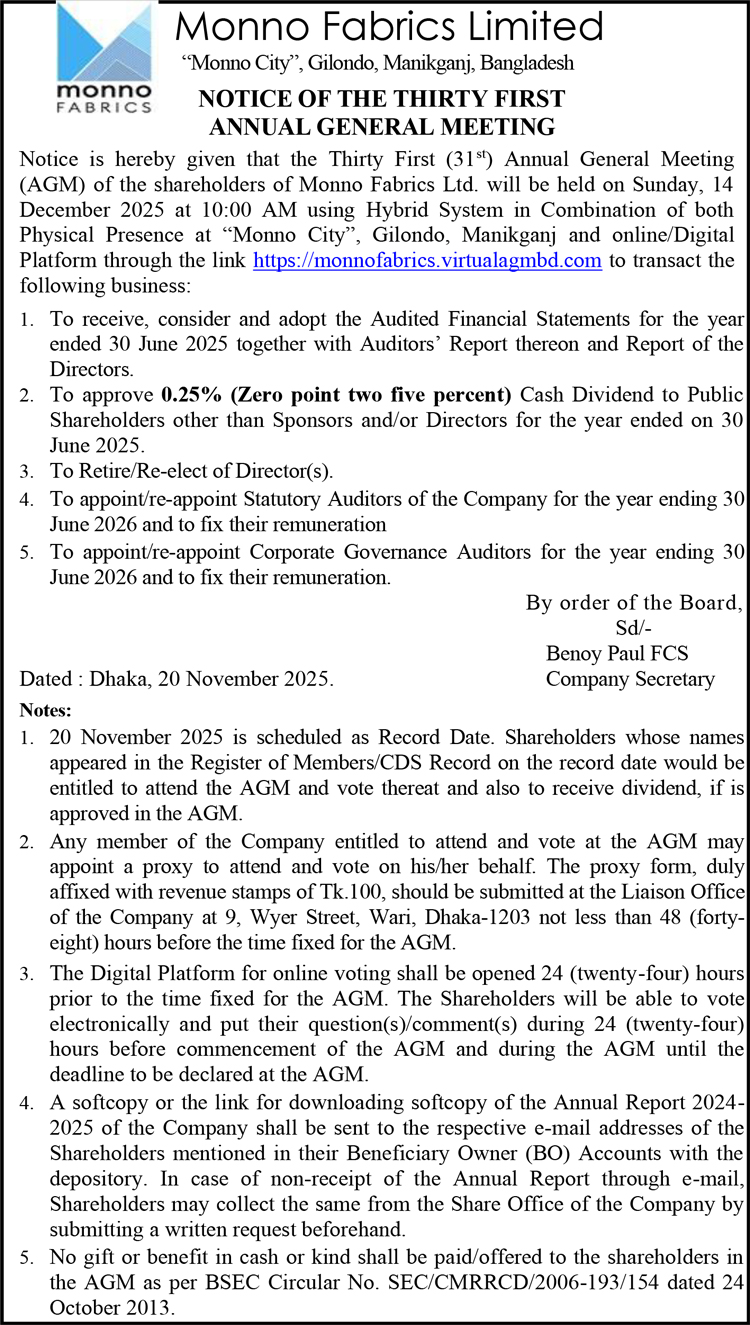 Notice of the 31st AGM of Monno Fabrics Limited.