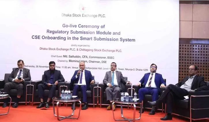 ঢাকা স্টক এক্সচেঞ্জের (ডিএসই) ডিজিটাল রূপান্তরের অংশ হিসেবে স্মার্ট ডিজিটাল সাবমিশন প্ল্যাটফর্ম উদ্বোধন করা হয়েছে। বুধবার (২৬ নভেম্বর) রাজধানীর নিকুঞ্জের ডিএসই টাওয়ারে মাল্টিপারপাস হলে ডিএসইর স্মার্ট সাবমিশন সিস্টেমে ‘রেগুলেটরি সাবমিশন মডিউল ও সিএসই অনবোর্ডিং’ আনুষ্ঠানিকভাবে উদ্বোধন করা হয়। অনুষ্ঠানে সভাপতিত্ব করেন ডিএসই’র চেয়ারম্যান মমিনুল ইসলাম।