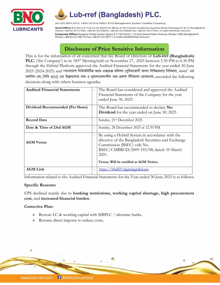 Price Sensitive Information of Lub-reff (Bangladesh) PLC.