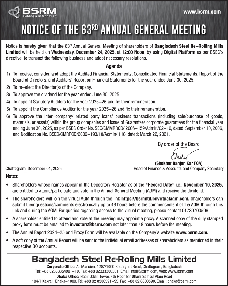Notice of the 63rd AGM of Bangladesh Re-Rolling Mills Limited