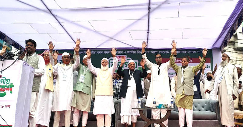 এর আগে দুপুর ১২ টায় পবিত্র কোরআন তেলাওয়াতে মাধ্যমে সমাবেশ শুরু হয়। জুলাই জাতীয় সনদ বাস্তবায়ন ও জাতীয় নির্বাচনের আগে গণভোট আয়োজনসহ ৫ দফা দাবিতে এই সমাবেশের আয়োজন করা হয়েছে। অর্থসহ পবিত্র কোরআন থেকে তেলাওয়াত করেন কাজী ইকরামুল কবীর। পরে শুরু হয় ইসলামী সংগীত। পরে ৮ দলের স্থানীয় ও জাতীয় পর্যায়ের নেতাকর্মীরা বক্তৃতা করেন। সমাবেশে বক্তারা নির্বাচনের আগে গণভোট আয়োজনের দাবি জানান।